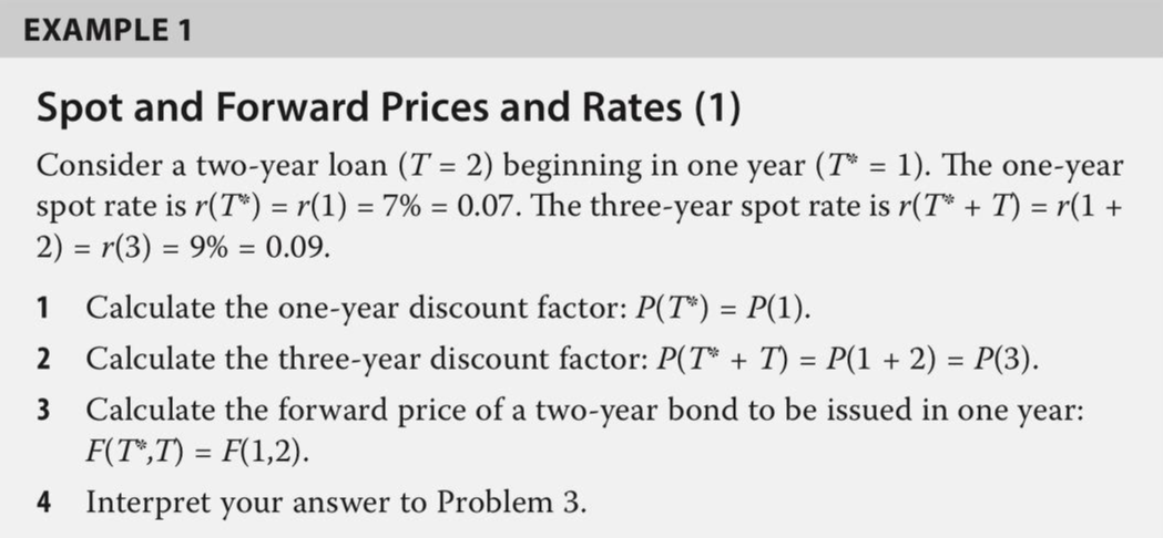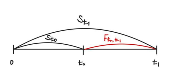 교재에서는 위와 같이 discount factor $P(T)$와 fwd contract price $F(T_0, T_1)$ 간의 관계식으로 설명하는데, rate로 설명하는 아래의 방식이 조금 더 이해하기 편하다. 사실상 동일한 식이다.